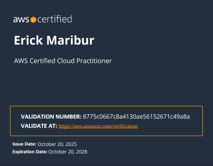 Estamos muy orgullosos de compartir una gran noticia: ¡Nuestro talentoso colega, Erick Maribur ha obtenido la certificación AWS Certified Cloud Practitioner